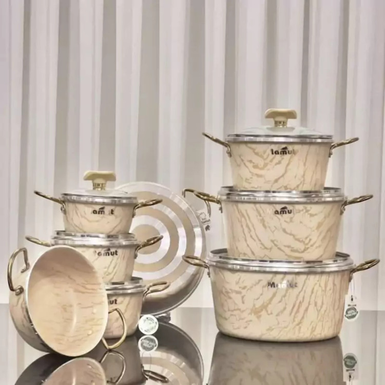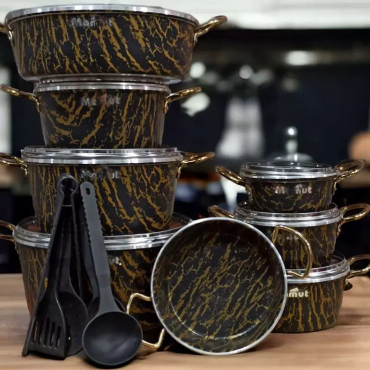 سرویس قابلمه گرانیتی 21 پارچه برند ماموت (Mamut) 🔺پوشش داخلی گرانیت فوقالعاده باکیفیت 🔺 کاملا نچسب و ضد خط و خش 🔺طرح داخلی و بیرونی ماربل 🔺 دسته فلزی ضدزنگ طلایی رنگ 🔺 دارای 6 قابلمه با درب پیرکس نشکن و 2 تابه 🔺 سایز قابلمهها 14، 16، 18، 20، 24 و 28 🔺 سایز تابهها 18 و 28 (درب مشترک با قابلمه سایز 18 و 28) 🔺 دارای 2 عددوکفگیر و ملاقه دارای 2 عدد دستگیره